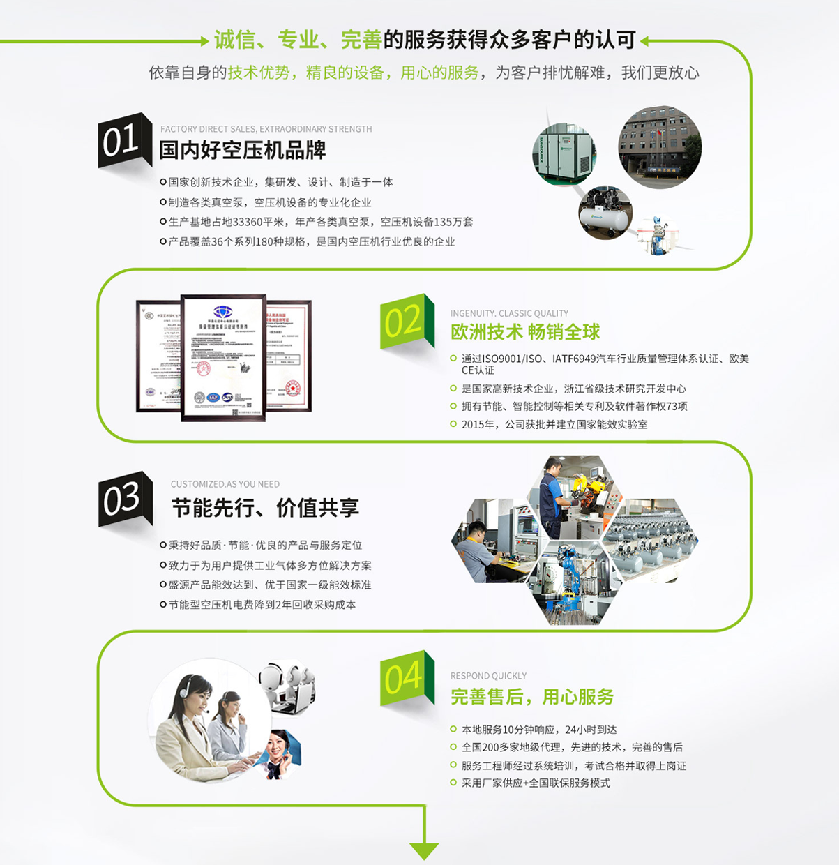 浙江盛源空壓機制造有限公司是一家研究制造無油真空泵系列、新能源電動空壓機、空氣壓縮機設備、器材、永磁伺服電機、工業(yè)投資等多元化經(jīng)營的大型企業(yè),是國家高新技術企業(yè),浙江省級技術研究開發(fā)中心。